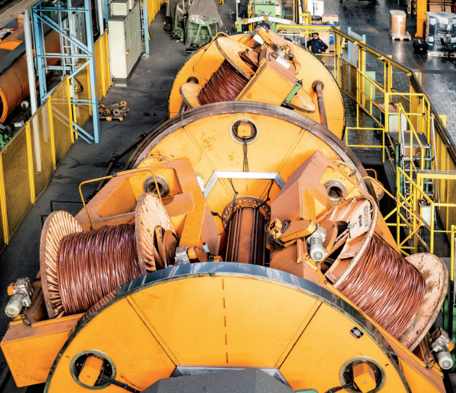 Beim Schirmflechten von Hochspannungskabeln spielt der Schleifringkörper mit einer Bohrung von Ø 280 mm eine zentrale Rolle. Er ermöglicht eine präzise Führung der Leiterstränge und sorgt durch seine Drehbewegung für eine gleichmäßige Flechtung des Metallschirms, der das Kabel vor elektromagnetischen Störungen schützt.